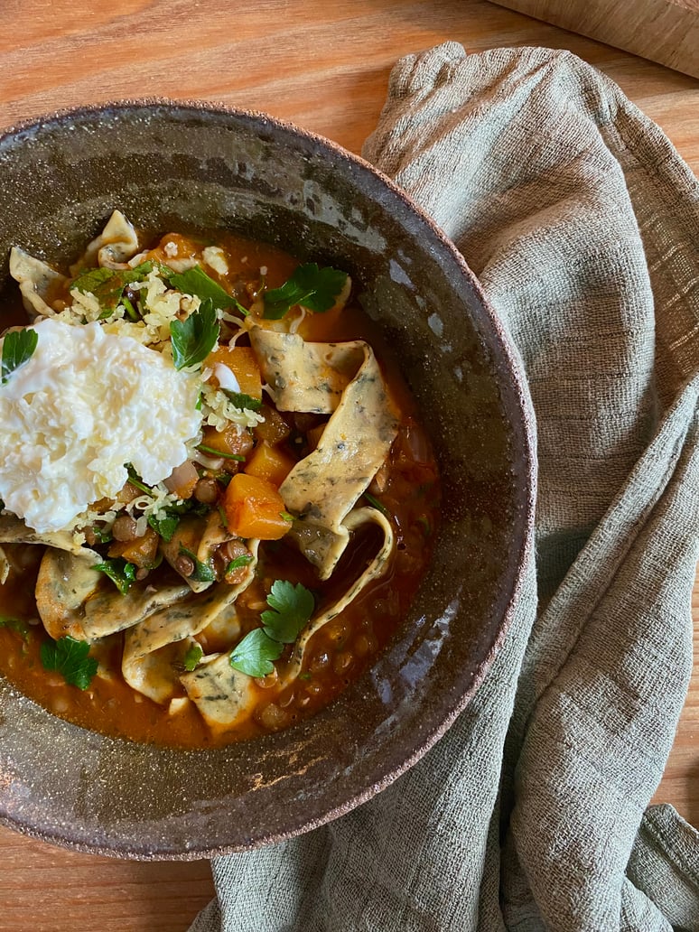 Servir en mélangeant les papparadelles et les 3/4 du persil à la soupe aux lentilles. Dresser avec le reste de persil, un généreux filet d’huile d’olive et une belle pincée de tomme de chèvre râpé.